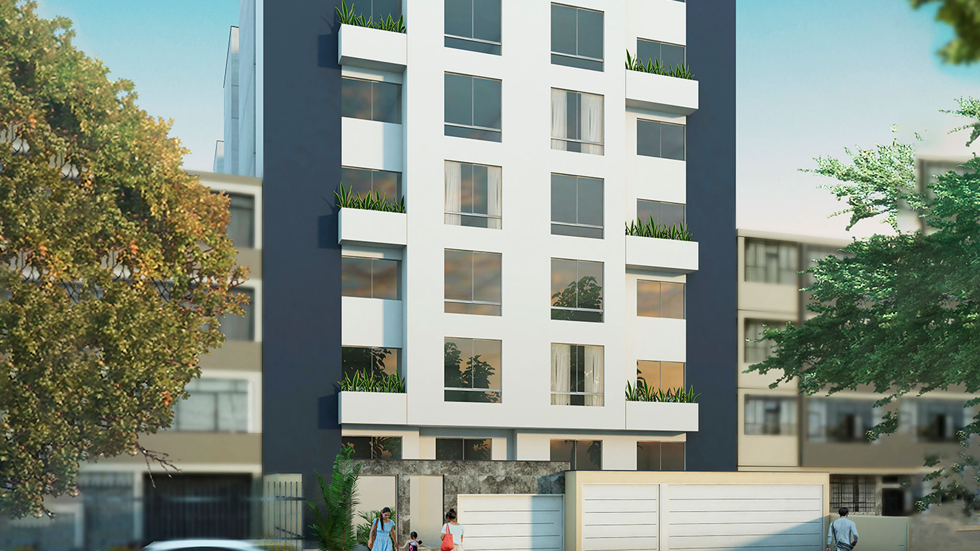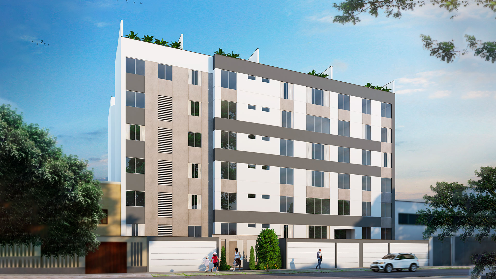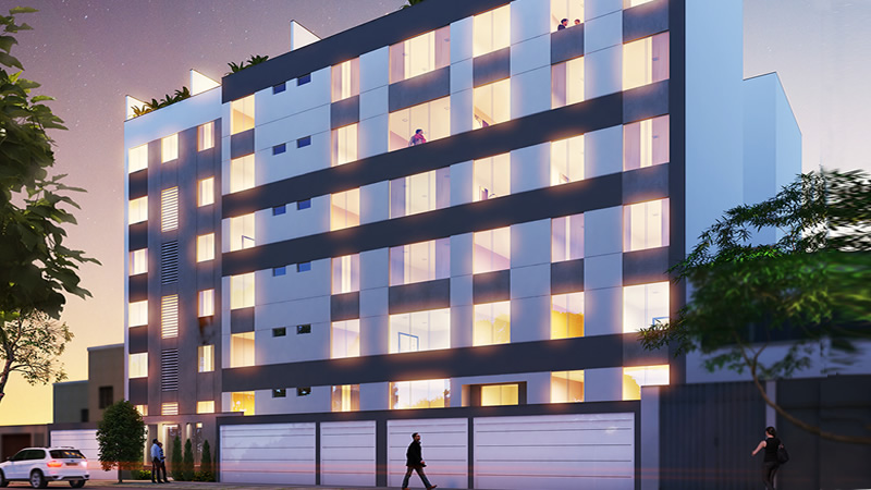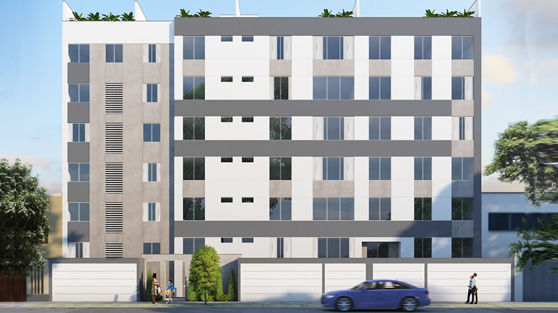 El proyecto consiste en un edificio de vivienda multifamiliar con semisótano, 6 pisos y azotea, con 50 departamentos, a razón de 8 departamentos del primer piso al quinto piso y 10 departamentos en el sexto piso. Los departamentos duplex están ubicados en el sexto piso, ocupando dos niveles (sexto piso y azotea), cada uno con acceso al nivel superior a través de una escalera interna.