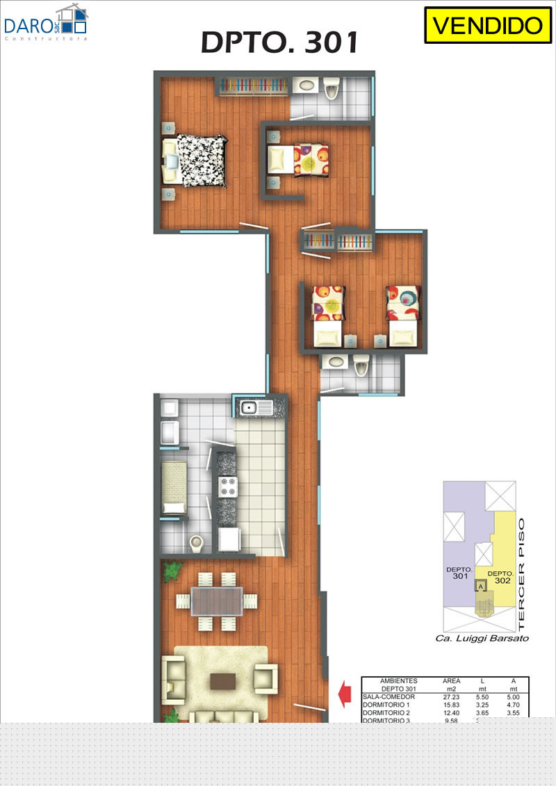 Departamento 301 del tercer piso con 114.20 m2. Consiste en sala-comedor, cocina, patio-lavandería, cuarto de servicio, baño de servicio, baño secundario, hall, 3 dormitorios, baño principal incluido en el dormitorio principal.