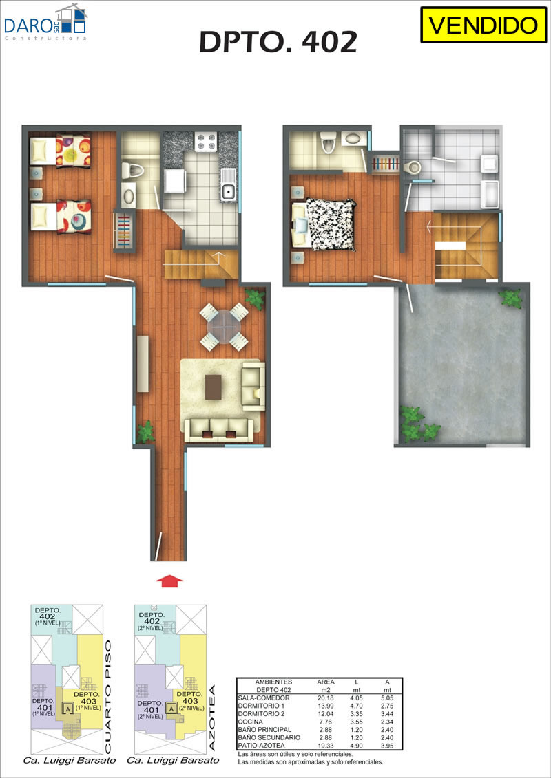 Departamento 401 del cuarto piso con 92.06 m2 de área techada (45.34 m2 en el primer nivel y 46.72 m2 en el segundo nivel) y 19.99 m2 de área libre, con dos niveles. El primer nivel consiste en sala-comedor con escalera, cocina, baño de visita y el segundo nivel consiste en hall, 2 dormitorios, baño secundario, terraza, patio-lavandería, baño de servicio.