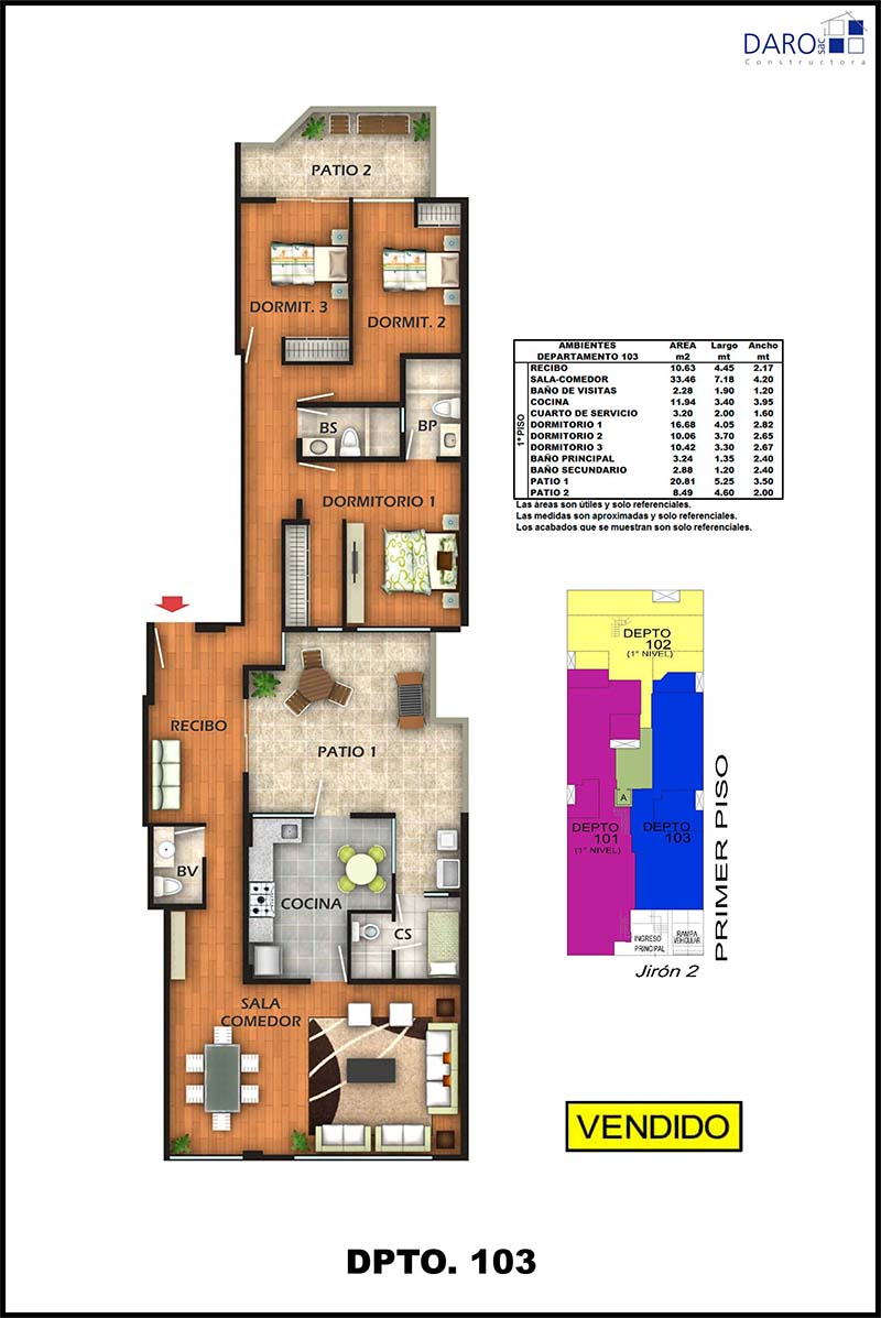 Departamento 103 del primer piso con 137.82 m2 de área techada y 30.48 m2 de área libre. Consiste en recibo, sala-comedor, baño de visita, cocina, patio-lavandería, cuarto y baño de servicio, 3 dormitorios, baño principal incorporado en el dormitorio principal, baño secundario, 2 patios interiores.