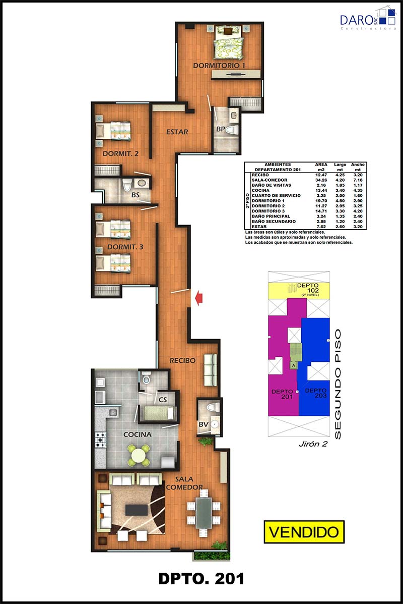 Departamento 201 del segundo piso con 163.04 m2 de área techada. Consiste en recibo, sala-comedor, baño de visita, cocina, patio-lavandería, cuarto y baño de servicio, 3 dormitorios, baño principal incorporado en el dormitorio principal, baño secundario, estar.