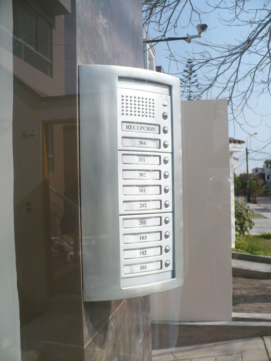 Portero electrónico en el ingreso principal del edificio (peatonal), con chapa eléctrica conectada al intercomunicador de cada departamento.