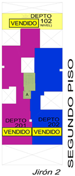 Departamento 102 del primer piso con 138.53 m2 de área techada (80.74 m2 en el primer nivel y 57.79 m2 en el segundo nivel) y 57.70 m2 de área libre, ocupa dos niveles. El primer nivel consiste en sala-comedor, cocina, patio-lavandería, cuarto y baño de servicio, 1 dormitorio, baño secundario, 3 patios interiores, escalera de acceso al segundo nivel y el segundo nivel consiste en estar, 2 dormitorios, baño principal incorporado en el dormitorio principal.