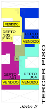 Departamento 302 del tercer piso con 132.76 m2 de área techada (79.53 m2 en el primer nivel y 53.23 m2 en el segundo nivel) y 26.36 m2 de área libre, ocupa dos niveles. El primer nivel consiste en recibo, sala, comedor, cocina, 1 dormitorio, baño secundario, escalera de acceso al segundo nivel y el segundo nivel consiste en estar, 1 dormitorio, baño secundario, patio-lavandería, cuarto y baño de servicio, patio-azotea.