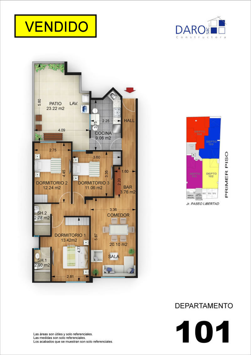 Departamento 101 ubicado en primer piso con 91.30 m2 de área techada y 23.22 m2 de área libre. Consiste en Sala-comedor, Cocina, Lavandería, un patio interior, Baño secundario, tres dormitorios c/closet, Baño principal incorporado en el dormitorio principal.
