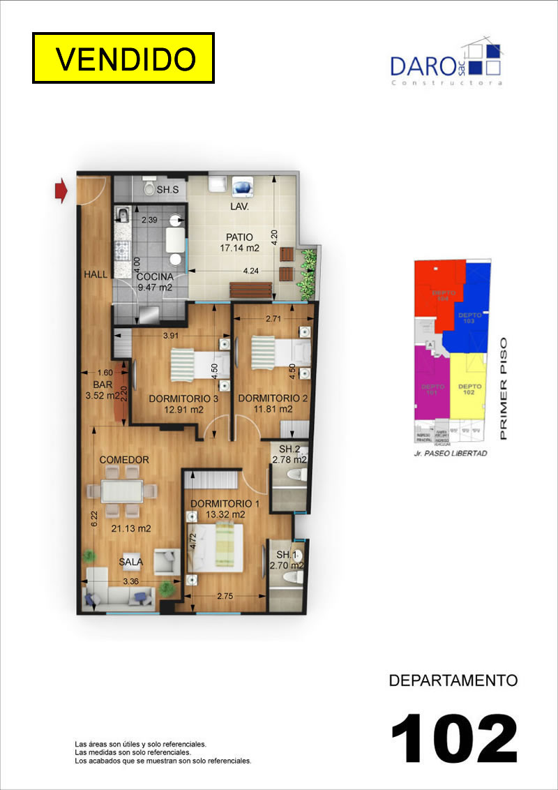 Departamento 102 ubicado en primer piso con 97.82 m2 de área techada y 17.14 m2 de área libre. Consiste en Sala-comedor, Cocina, Baño de servicio, Lavandería, un patio interior, Baño secundario, tres dormitorios c/closet, Baño principal incorporado en el dormitorio principal.