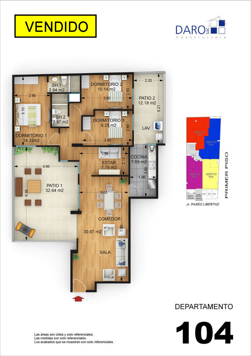 Departamento 104 ubicado en primer piso con 100.07 m2 de área techada y 44.82 m2 de área libre. Consiste en Sala-comedor, Cocina, Lavandería, dos patios interiores, Estar, Baño secundario, tres dormitorios c/closet, Baño principal incorporado en el dormitorio principal.