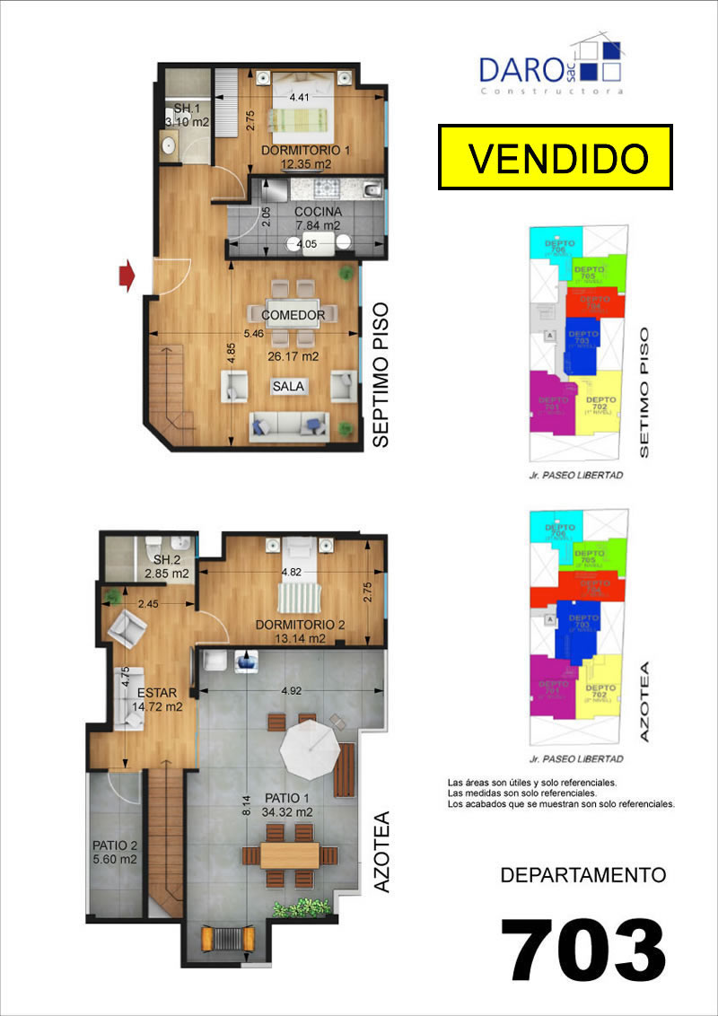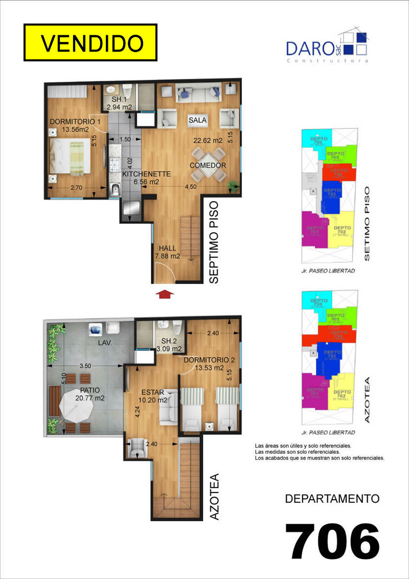 "Departamento 706 ubicado en sétimo piso con 97.43 m2 de área techada (58.91 m2 en el primer nivel y 38.52 m2 en el segundo nivel) y 20.77 m2 de área libre, ocupa dos niveles. El primer nivel consiste en Sala-comedor, Kitchenette, Baño principal, un dormitorio c/closet, Escalera de acceso al segundo nivel y el segundo nivel consiste en Estar, un dormitorio, Baño secundario, Lavandería, patio-azotea."