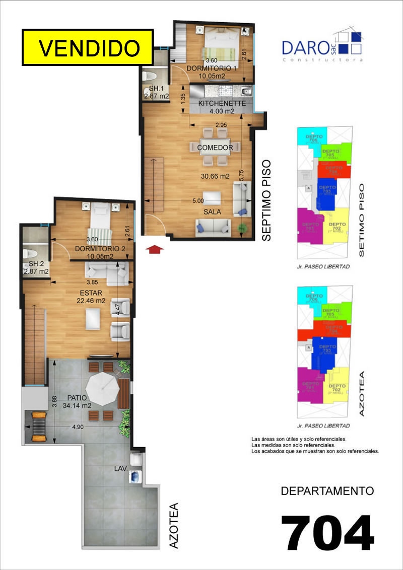 Departamento 704 ubicado en sétimo piso con 90.01 m2 de área techada (51.09 m2 en el primer nivel y 38.92 m2 en el segundo nivel) y 34.14 m2 de área libre, ocupa dos niveles. El primer nivel consiste en Sala-comedor, Kitchenette, Baño principal, un dormitorio c/closet, Escalera de acceso al segundo nivel y el segundo nivel consiste en Estar, un dormitorio, Baño secundario, Lavandería, patio-azotea.