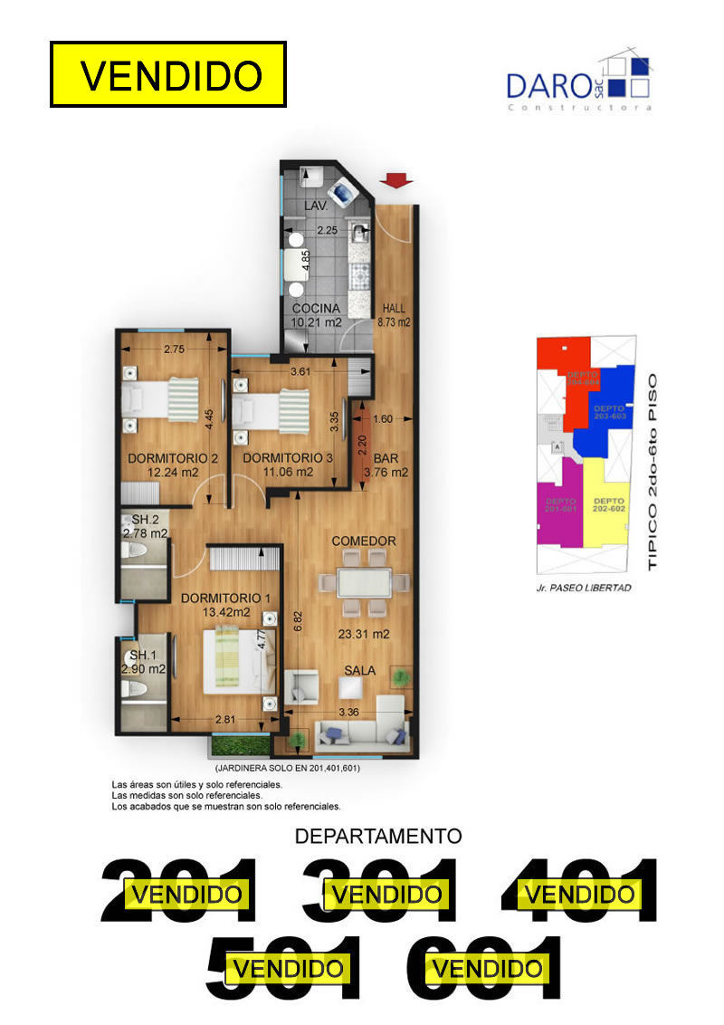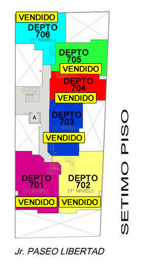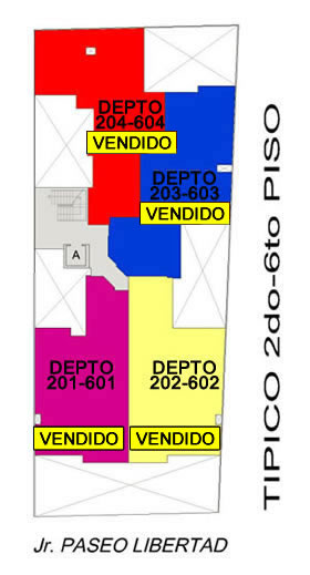 Departamento 201 ubicado en segundo piso, Departamento 301 ubicado en tercer piso, Departamento 401 ubicado en cuarto piso, Departamento 501 ubicado en quinto piso, Departamento 601 ubicado en sexto piso, cada uno con 96.34 m2 de área techada. Consisten en Sala-comedor, Cocina-Lavandería, Baño secundario, tres dormitorios c/closet, Baño principal incorporado en el dormitorio principal.