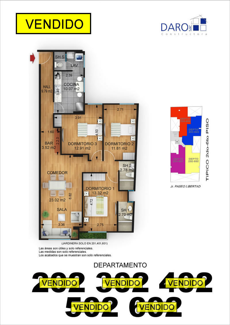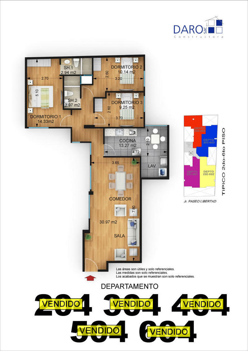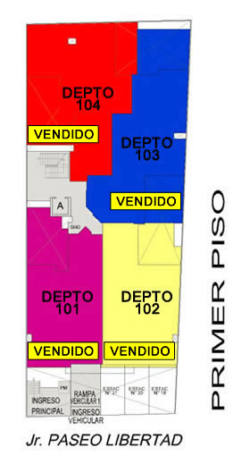 Departamento 203 ubicado en segundo piso, Departamento 303 ubicado en tercer piso, Departamento 403 ubicado en cuarto piso, Departamento 503 ubicado en quinto piso, Departamento 603 ubicado en sexto piso, cada uno con 100.35 m2 de área techada. Consisten en Recibo, Sala-comedor, Cocina-Lavandería, Baño secundario, tres dormitorios c/closet, Baño principal incorporado en el dormitorio principal.